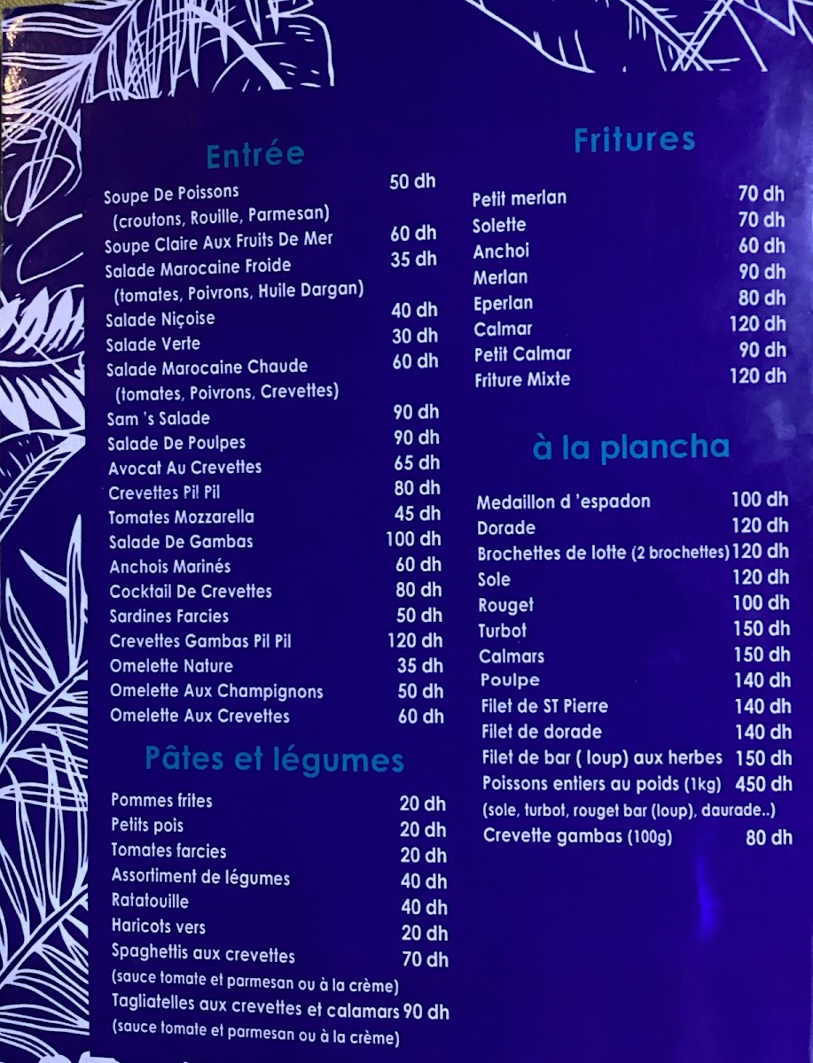 Sam's menu showcases a delightful array of fresh seafood dishes that will tantalize your taste buds. Highlights include the renowned octopus tagine, praised for its incredible flavors, and the exquisitely prepared sole, served alongside a rich fish soup. Whether you're a seafood aficionado or just looking for a memorable meal, every bite at Sam's is a testament to quality and freshness, sourced daily from local ports.